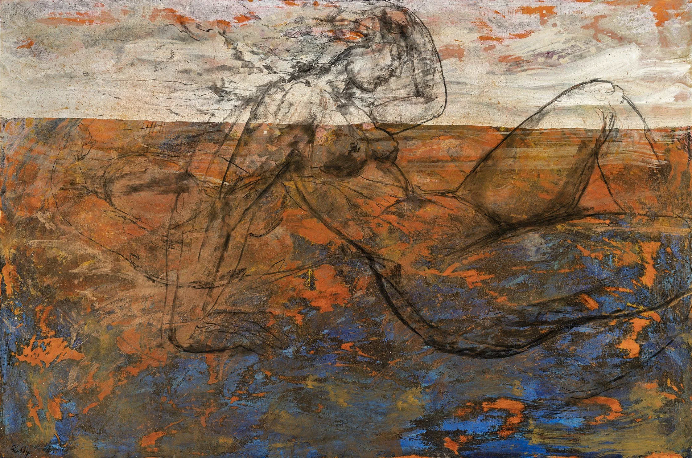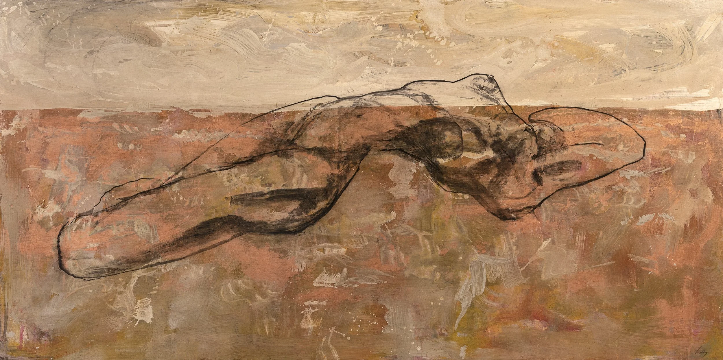 of the water, spraying the canvas with flecks of blue. Another reclining figure rises to the horizon line, bleeding pink.